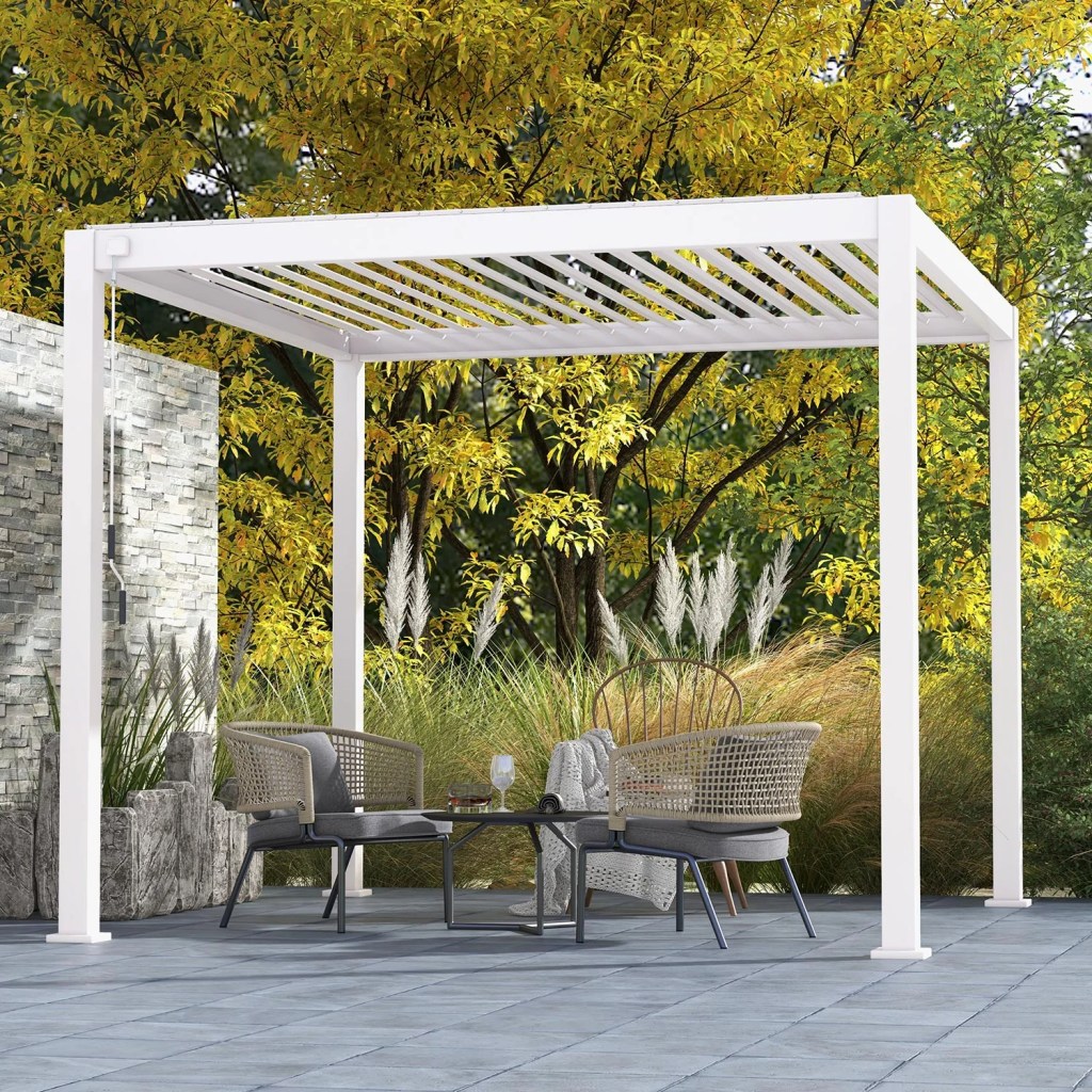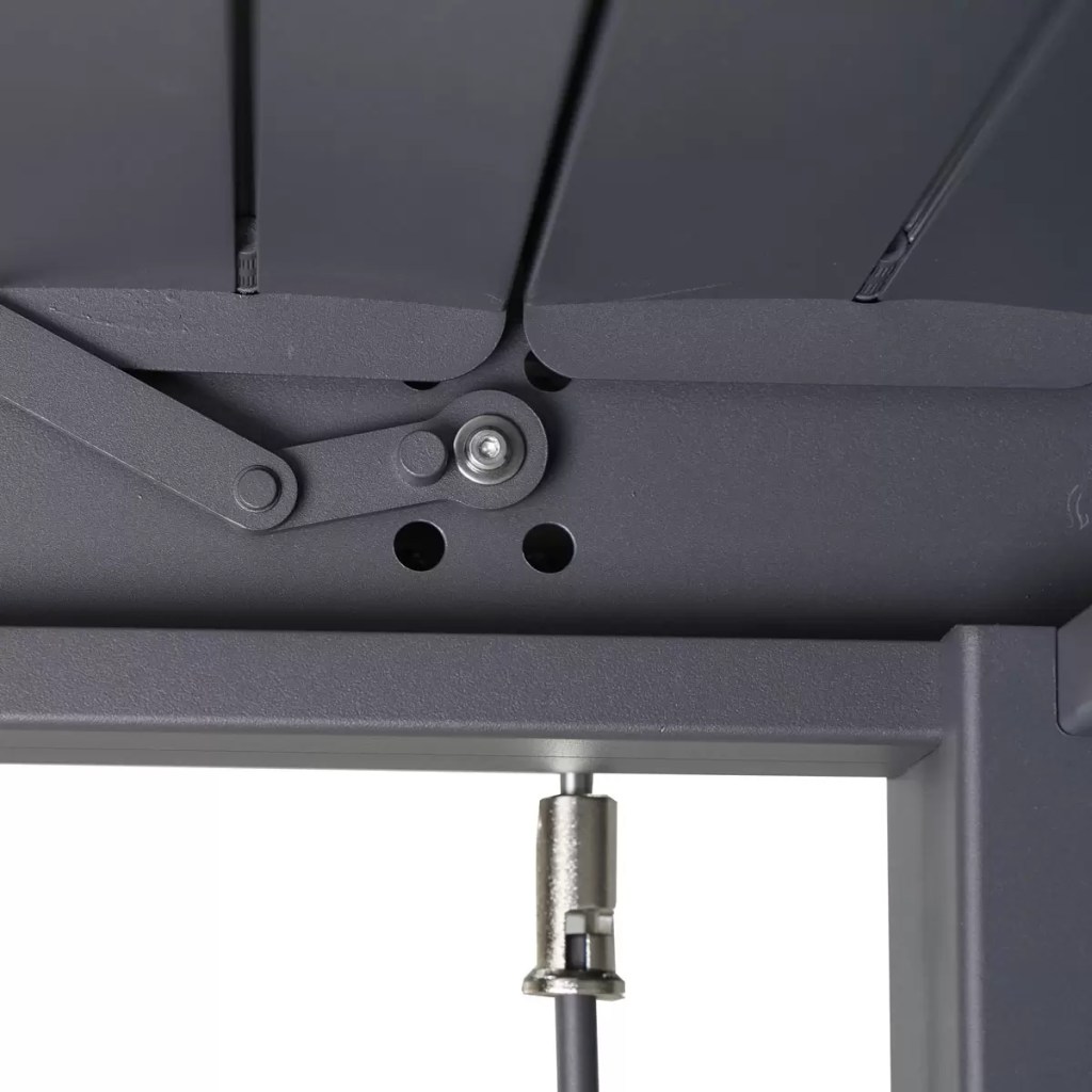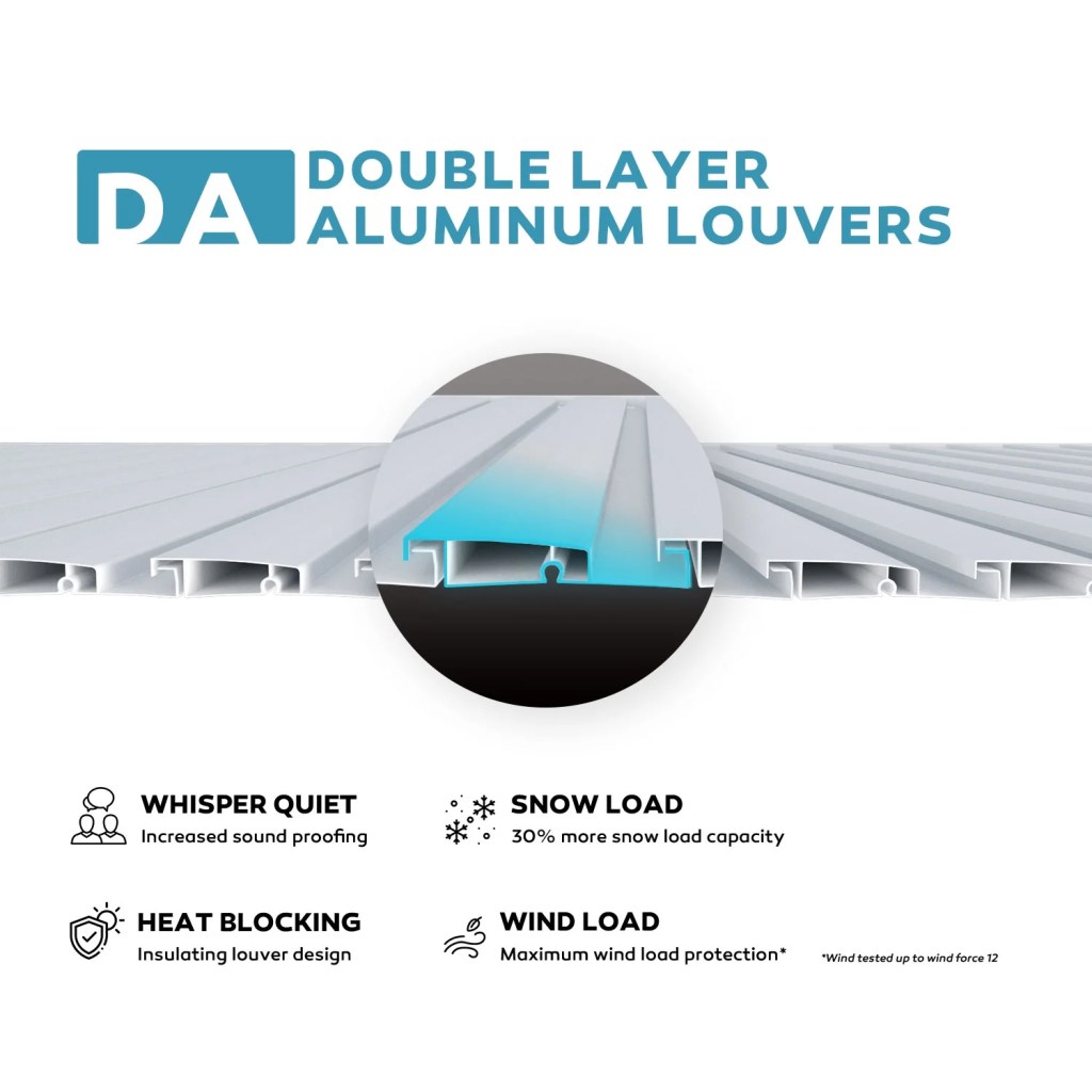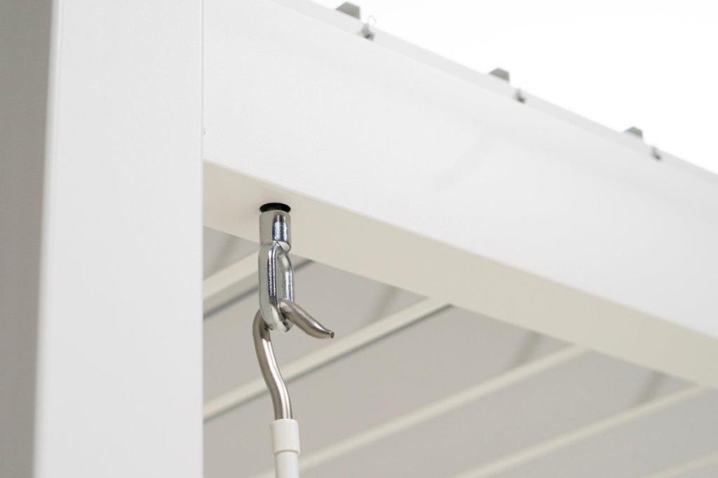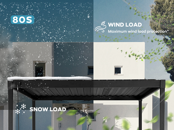 Budući da je krov u potpunosti izrađen od visokokvalitetnog aluminija, konstrukcija u potpunosti ne zahtijeva održavanje. Ovisno o modelu koji kupite, vaša pergola ima kapacitet opterećenja snijegom od 62 ili 80 kg/m2 i otpornost na brzine vjetra od 117 ili 132 kmh. U ekstremnim vremenskim uvjetima, preporučamo da letvice ostanu otvoreni.