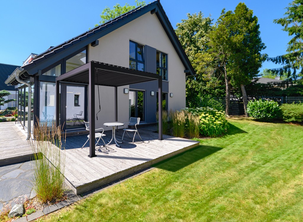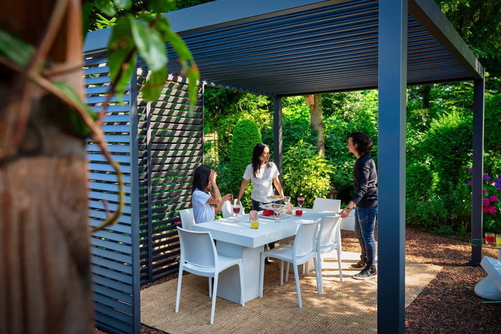 - JEDINSTVENO – jedinstveni nagibni lamelni krov: nagibne lamele nude mnoge mogućnosti zaštite od sunca, kiše i vjetra. Na taj način imate izbor sjediti na suncu ili u hladu. Ali čak i po kišnom vremenu ostajete suhi zahvaljujući krovu koji se može nagnuti.